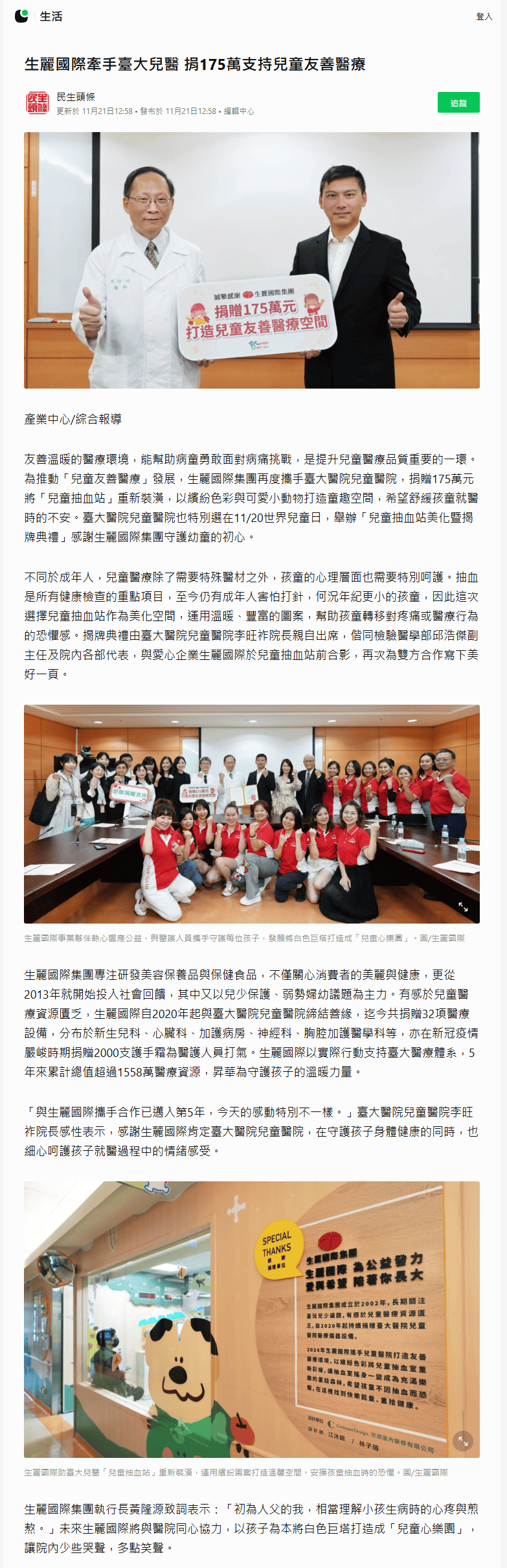 生麗國際牽手臺大兒醫 捐175萬支持兒童友善醫療
