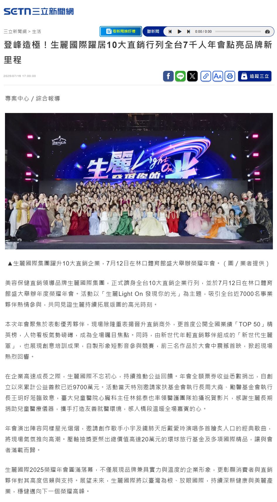 登峰造極!生麗國際躍居10大直銷行列全台7千人年會點亮品牌新里程