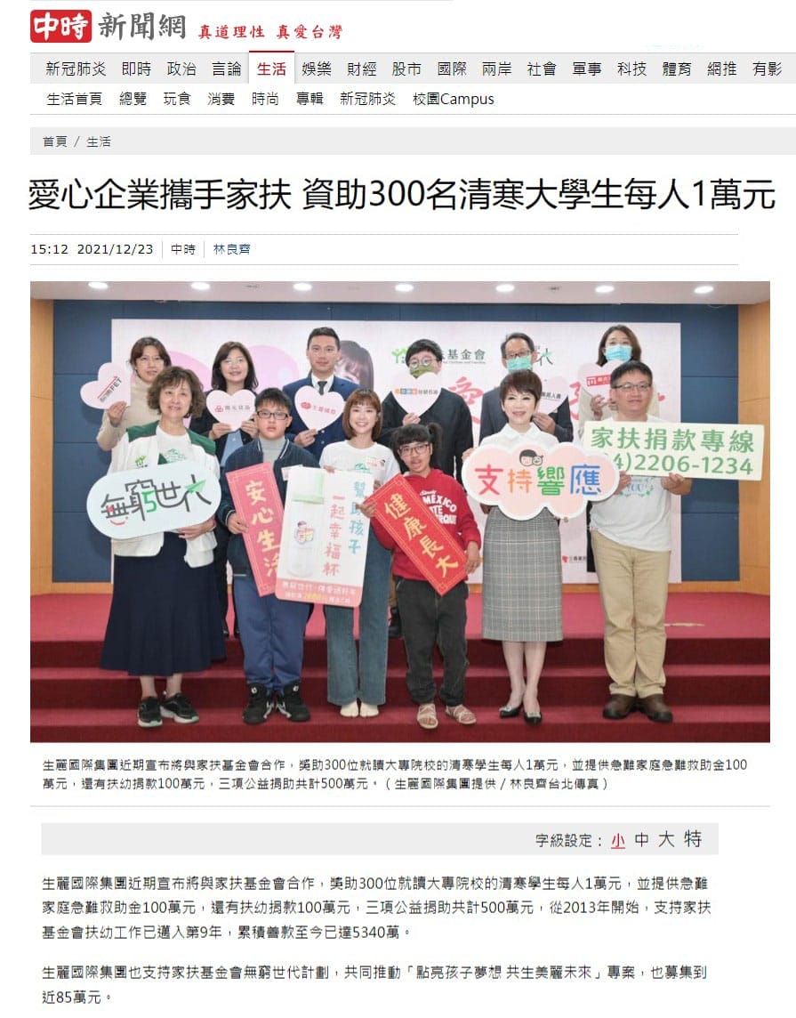 5. 2021-12-23 中國時報【愛心企業攜手家扶 資助300名清寒大學生每人1萬元】