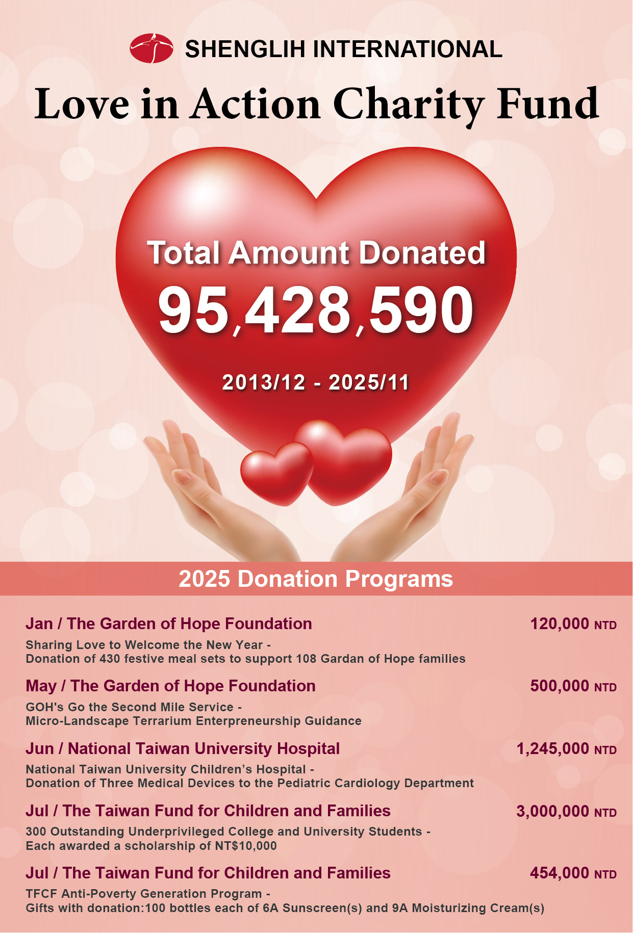 ShengLih Reaffirms Title Sponsorship of ‘Play Together,’ Promoting Sports Positivity More ShengLih International Donates Over NT$65 Million in 12 Years of Child Welfare Support More Zhōngjiǎo Bay Coastal Cleanup – ShengLih International in Action More ShengLih’s Sixth Donation of Medical Equipment, Partnering with NTU Children’s Hospital to Advance Pediatric Care More ShengLih International Contributes NT$3.31 Million to Empower and Protect Women and Children More ShengLih Donates 886 Sets of Lunar New Year Meals to Support 222 Families of the Garden of Hope Foundation More Hearts United in Charity: ShengLih Joins Hands with New Taipei and Southern Taichung Family Support to Spread Happiness More Multi-Level Marketing Protection Foundation – ShengLih Wins Double Excellence at the Direct Selling Charity Awards More ShengLih Donates NT$1.75M to Create Fairy Tale Forest for NTU Children More ShengLih “Shuttle Together” Badminton Event Joins Hands with the Taiwan Fund for Children and Families and Lee Yang for Charity More ShengLih × Taiwan Fund for Children and Families: Empowering Children with New Strength More ShengLih Donates NT$10 Million in Medical Equipment to Advance Healthcare with NTU Children’s Hospital More ShengLih Joins the Garden of Hope Foundation for the Fourth Time to Safeguard Women and Children More ShengLih Donates New Sports Shoes and Backpacks to Encourage Children to Pursue Their Dreams More ShengLih Donates 456 Lunar New Year Meal Sets to Support 114 Garden of Hope Families More Thanksgiving Charity Fair: ShengLih and the Taiwan Fund for Children and Families Unite for Public Welfare More ShengLih and the Taiwan Fund for Children and Families Launch the Endless Generation Initiative More ShengLih Marks 21st Anniversary with NT$3 Million Donation to Support Children’s Education More 生麗累計捐贈千萬醫療儀器 與台大兒醫並肩同行 More 生麗傳馨意 暖捐200萬助婦幼重生 More 生麗x勵馨 暖捐100瓶超水潤緊緻保濕安瓶挺公益 More «12»