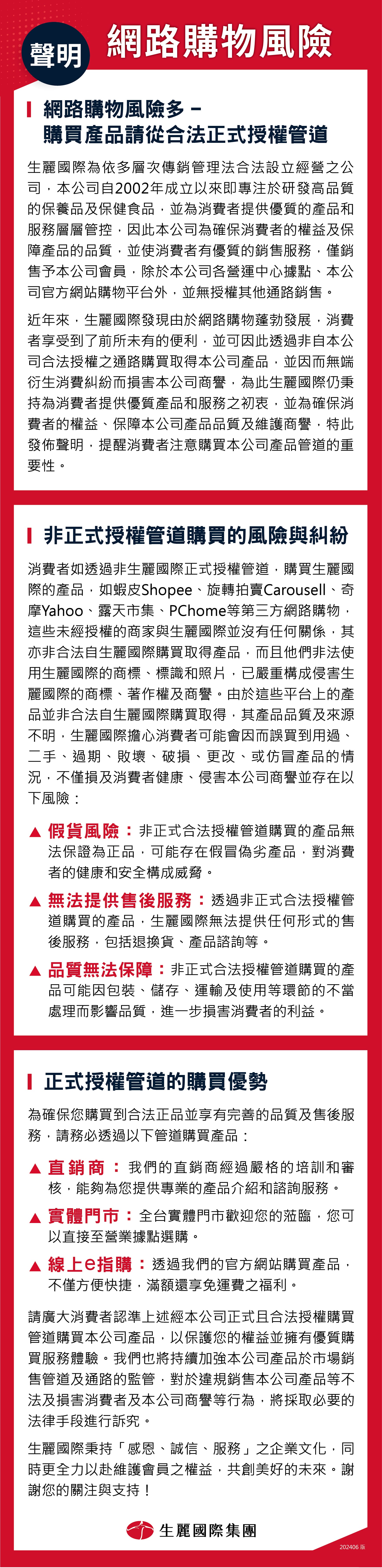 【生麗國際集團 聲明】 網路購物風險多「購買生麗產品」請從合法正式授權管道 生麗國際僅銷售予本公司會員,除於本公司各營運中心據點、本公司官方網站購物平台外,並無授權其他通路銷售。 為保障本公司產品品質及維護商譽,特此發佈聲明,提醒消費者注意購買本公司產品管道的重要性。 生麗國際秉持「感恩、誠信、服務」之企業文化,同時更全力以赴維護會員之權益,共創美好的未來。謝謝您的關注與支持! 生麗國際集團 分享到