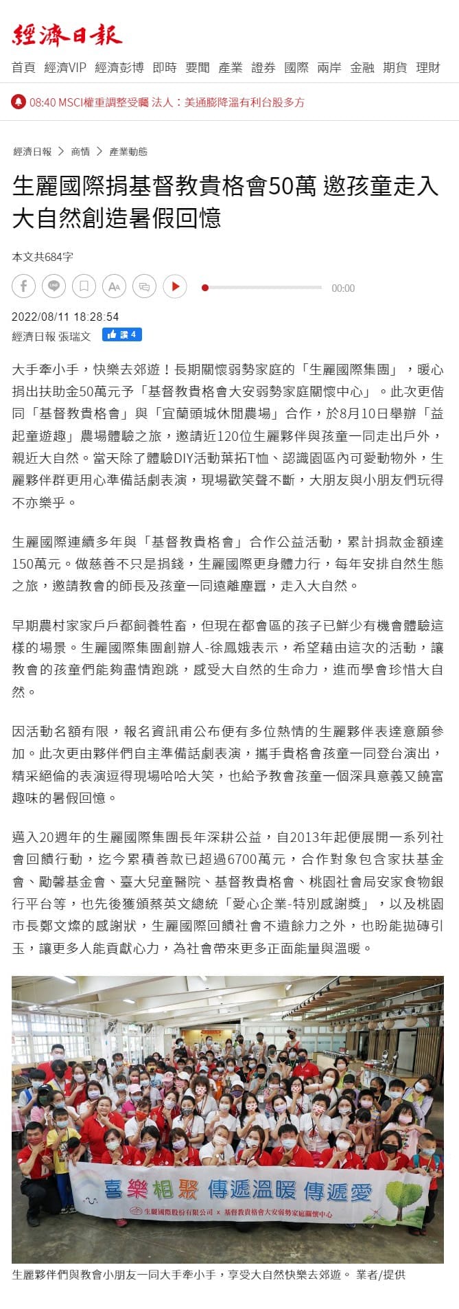 2022-8-11 經濟日報【生麗國際捐基督教貴格會50萬 邀孩童走入大自然創造暑假回憶】