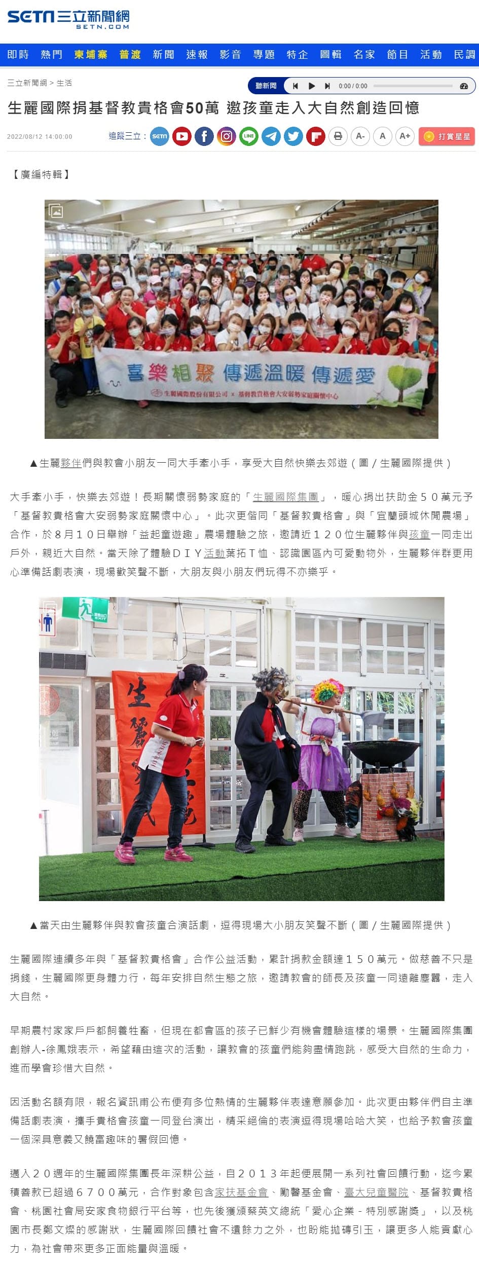 生麗國際捐基督教貴格會50萬 邀孩童走入大自然創造回憶 2022-8-12 三立新聞 報導連結:setn.com/news.aspx?from=search&key=%e7%94%9f%e9%ba%97&newsid=1160206 分享到