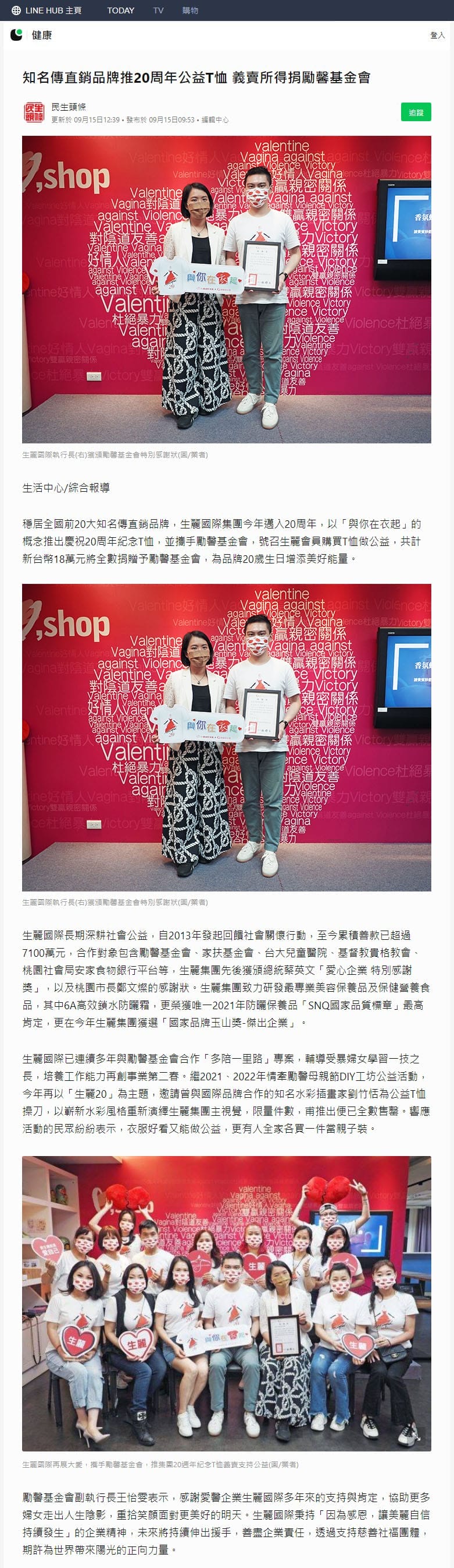 2022-9-15 LINE TODAY【知名傳直銷品牌推20周年公益T恤 義賣所得捐勵馨基金會】
