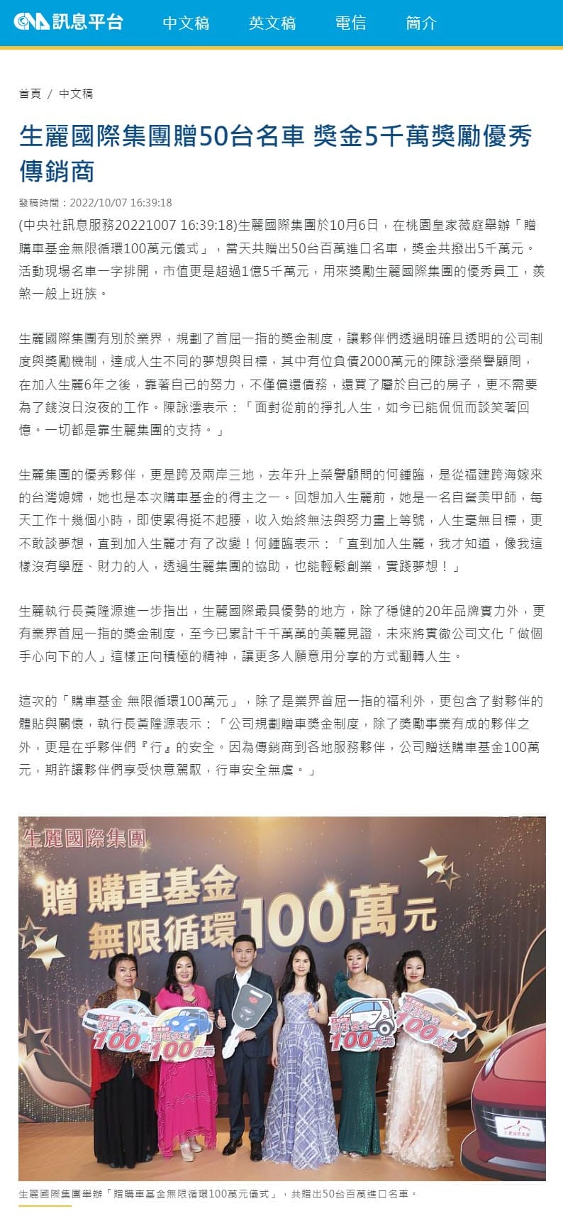 2022-10-7 中央社【生麗國際集團贈50台名車 獎金5千萬獎勵優秀傳銷商】