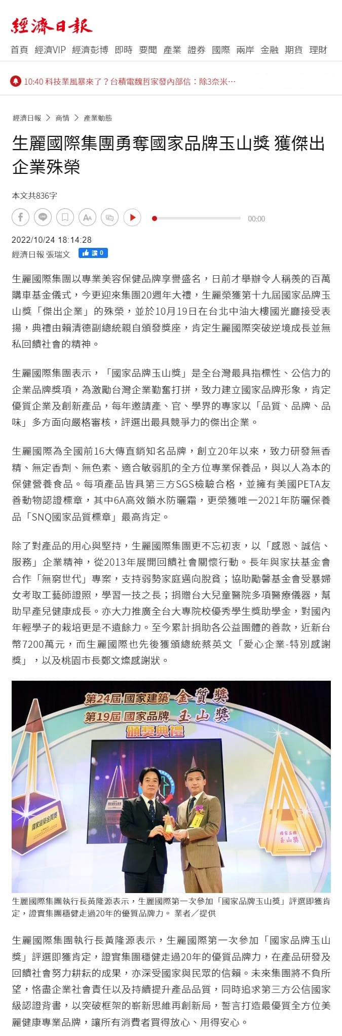 2022-10-24 經濟日報【生麗國際集團勇奪國家品牌玉山獎 獲傑出企業殊榮】