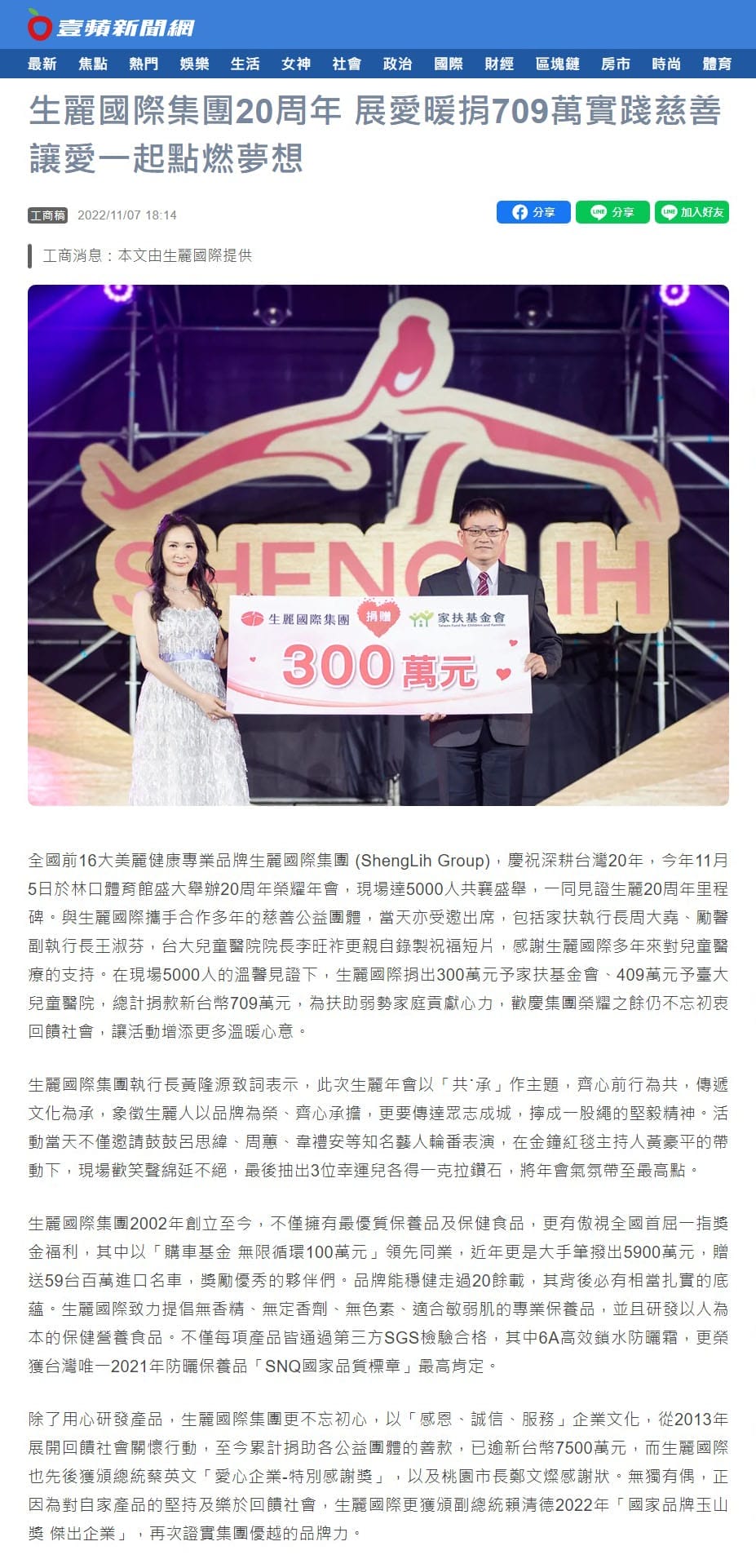 2022-11-8 壹蘋新聞網【生麗國際集團20周年 展愛暖捐709萬實踐慈善 讓愛一起點燃夢想】
