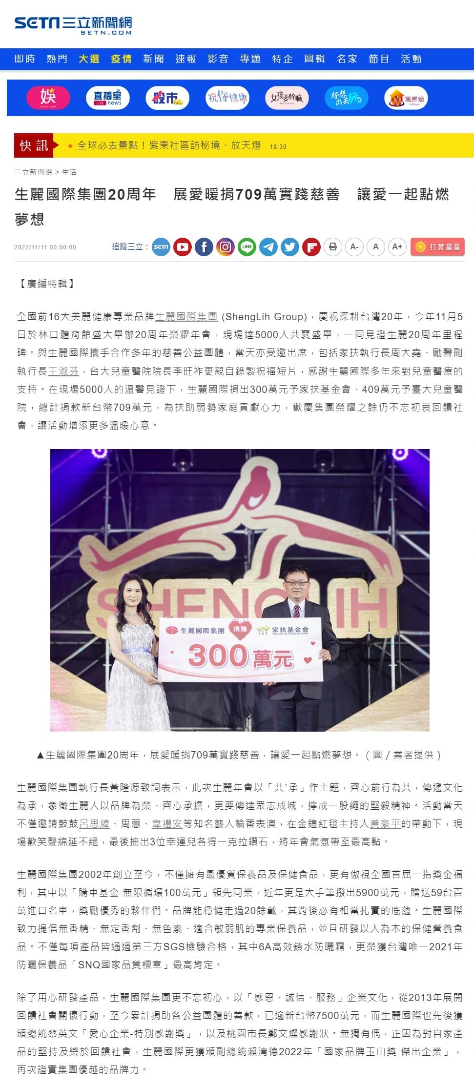 2022-11-11 三立新聞【生麗國際集團20周年 展愛暖捐709萬實踐慈善 讓愛一起點燃夢想】
