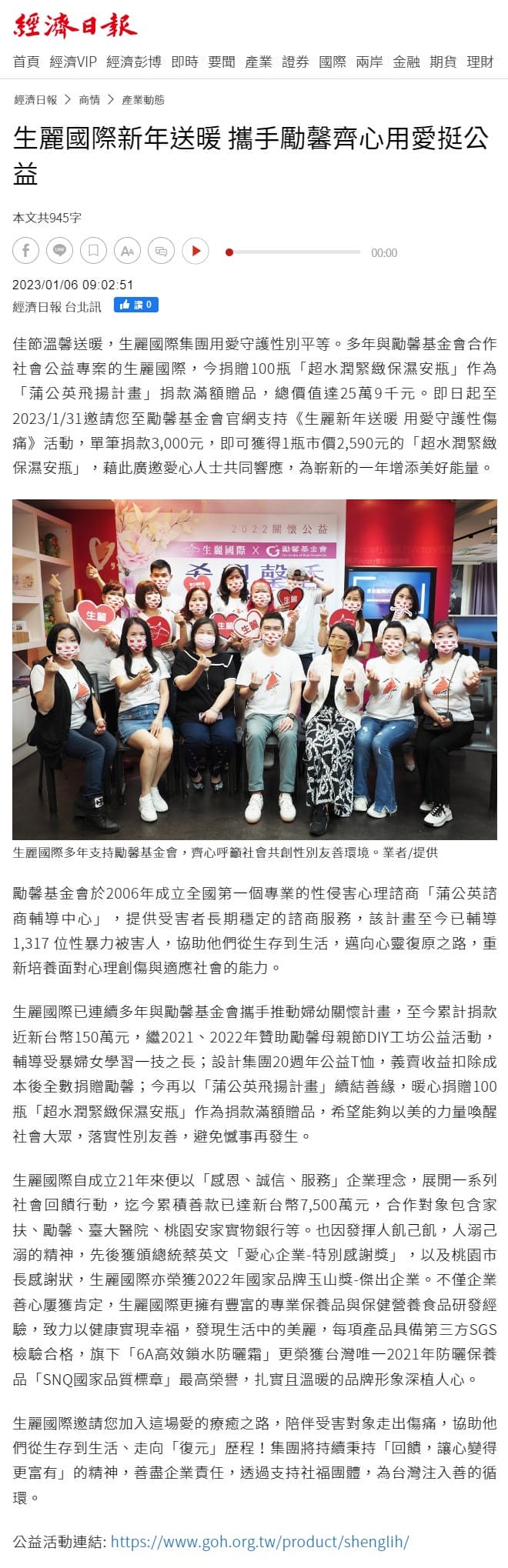2023-1-6 經濟日報【生麗國際新年送暖 攜手勵馨齊心用愛挺公益】