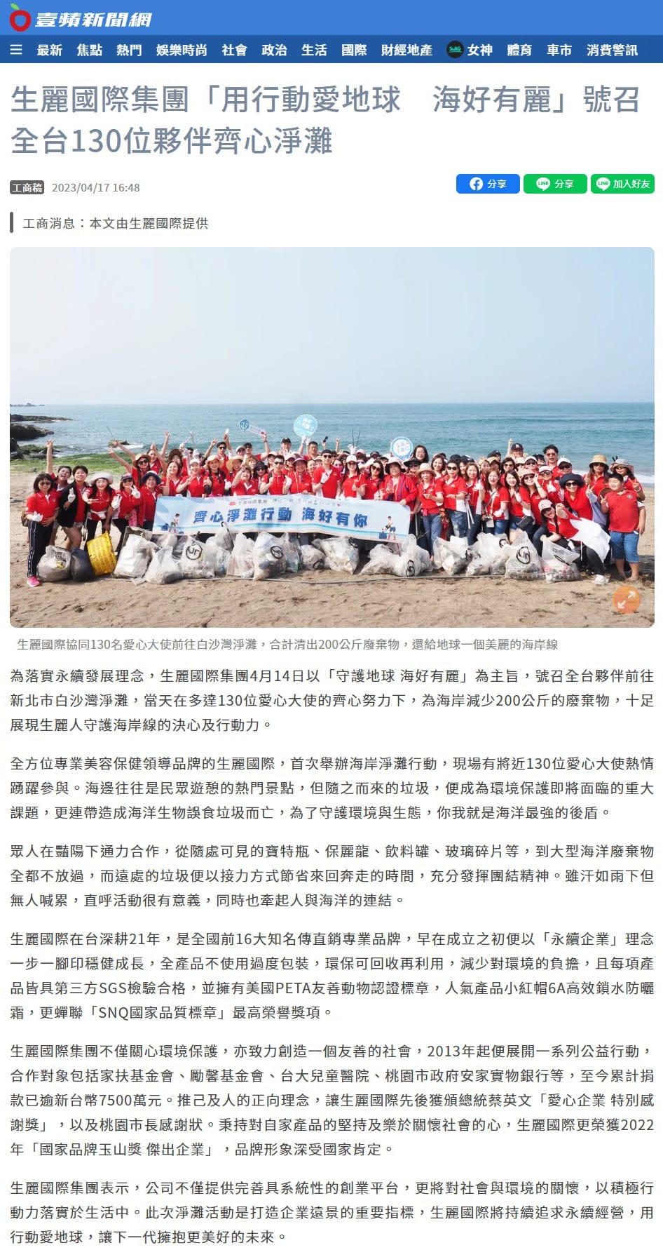 2023-4-17 壹蘋新聞【生麗國際集團「用行動愛地球 海好有麗」號召全台130位夥伴齊心淨灘】