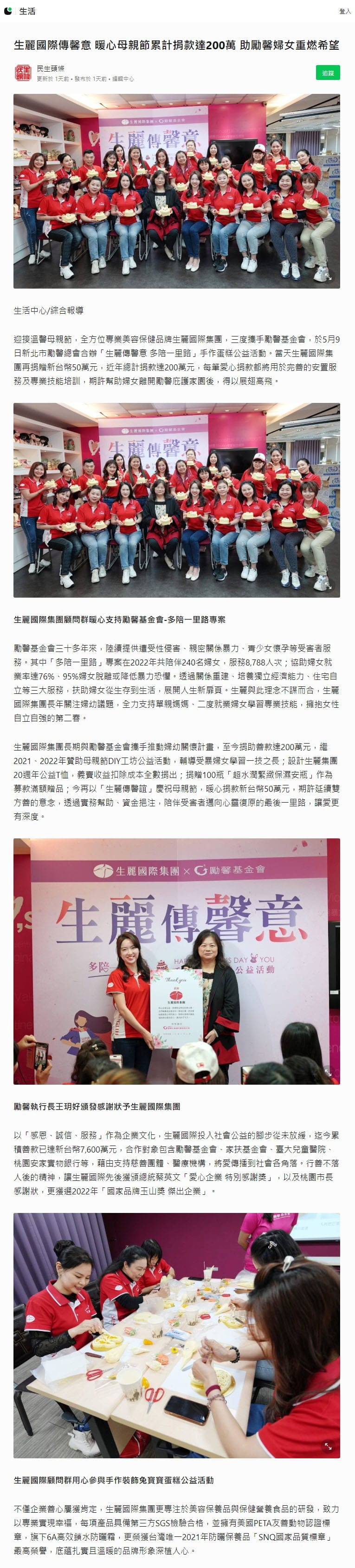 2023-5-10 LINE TODAY【生麗國際傳馨意 暖心母親節累計捐款達200萬 助勵馨婦女重燃希望】