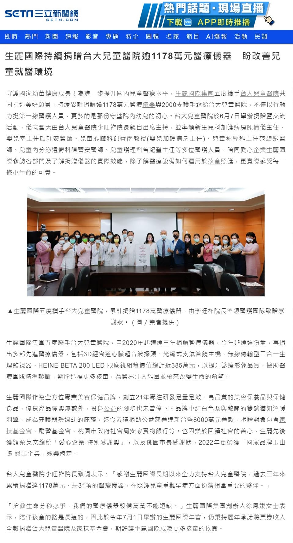 2023-6-8 三立新聞【生麗國際持續捐贈台大兒童醫院逾1178萬元醫療儀器 盼改善兒童就醫環境】