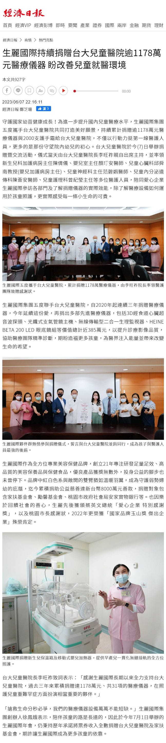 2023-6-8 經濟日報【生麗國際持續捐贈台大兒童醫院逾1178萬元醫療儀器 盼改善兒童就醫環境】