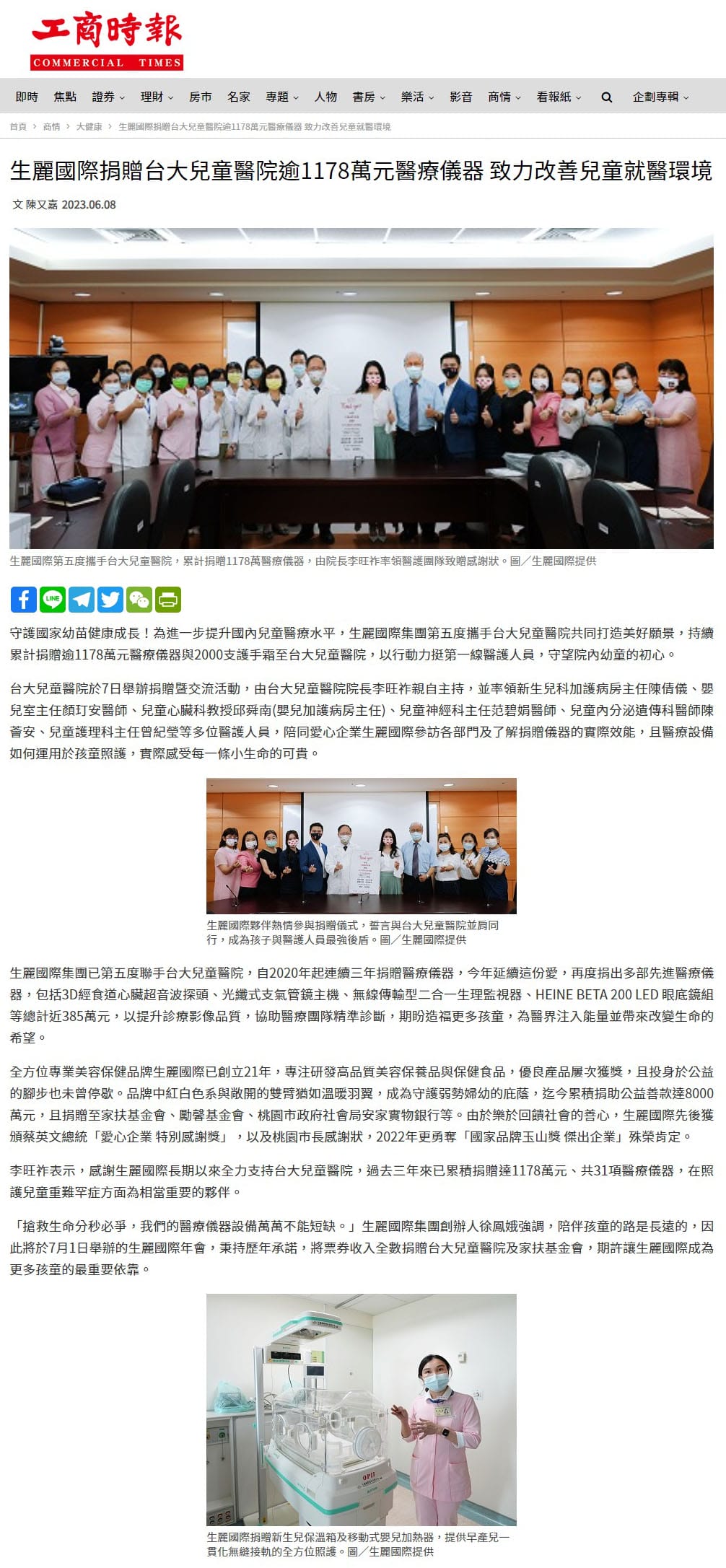 2023-6-8 工商時報【生麗國際捐贈台大兒童醫院逾1178萬元醫療儀器 致力改善兒童就醫環境】