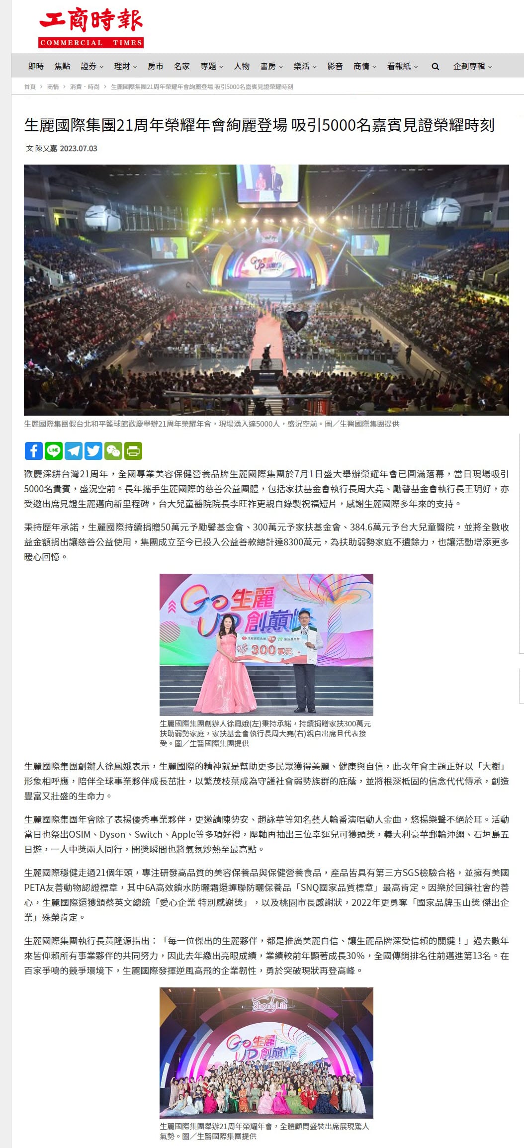 2023-7-3 工商時報【生麗國際集團21周年榮耀年會絢麗登場 吸引5000名嘉賓見證榮耀時刻】
