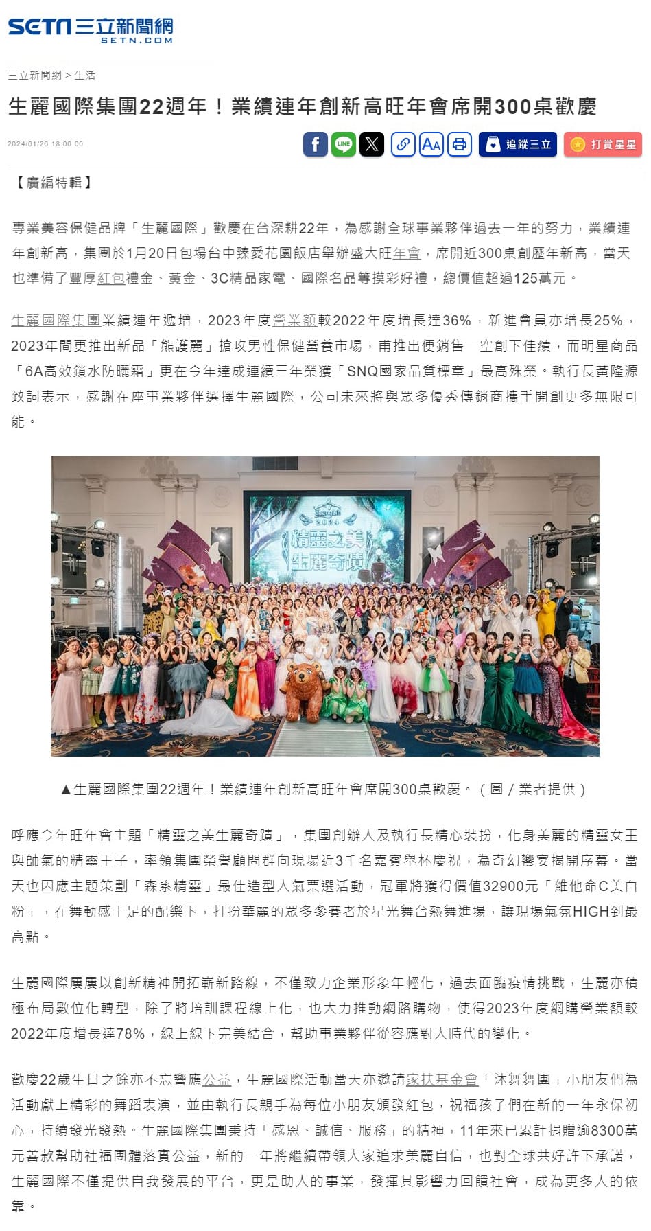 2024-1-26 三立新聞【生麗國際集團22週年!業績連年創新高旺年會席開300桌歡慶】