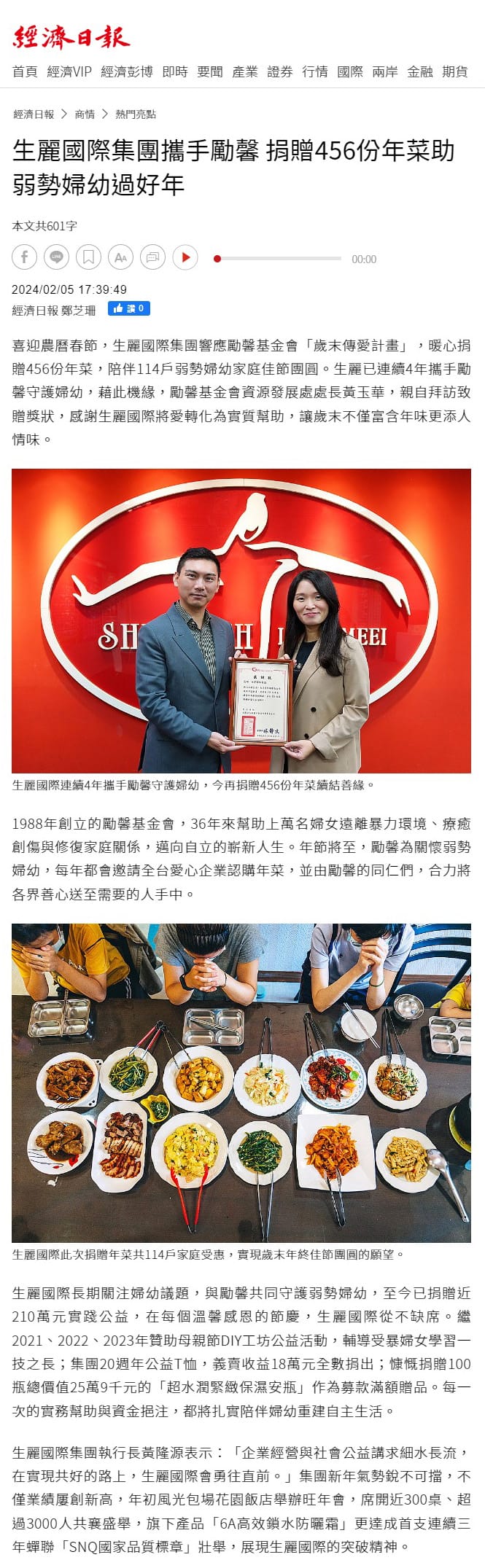 2024-2-6 經濟日報【生麗國際集團攜手勵馨 捐贈456份年菜助弱勢婦幼過好年】