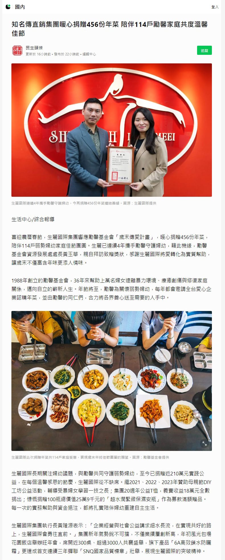 2024-2-6 LINE TODAY【知名傳直銷集團暖心捐贈456份年菜 陪伴114戶勵馨家庭共度溫馨佳節】