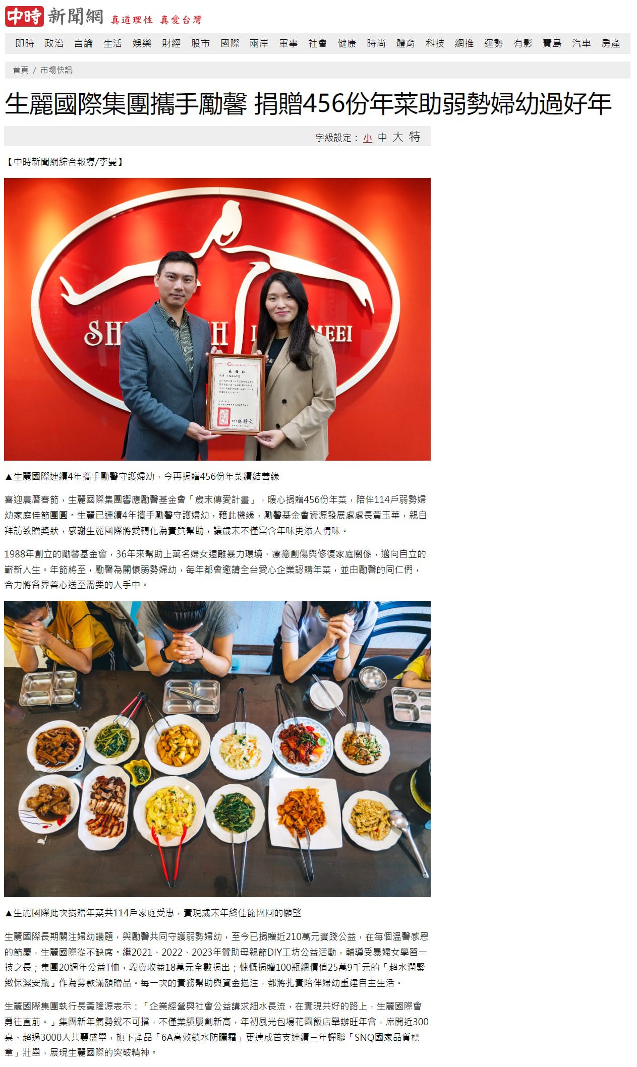 2024-2-6 中時新聞【生麗國際集團攜手勵馨 捐贈456份年菜助弱勢婦幼過好年】