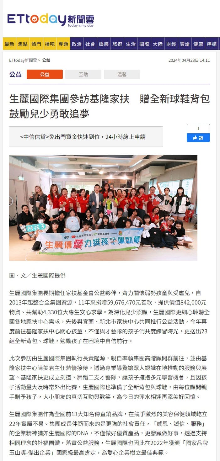 2024-4-23 ETtoday【生麗國際集團參訪基隆家扶 贈全新球鞋背包鼓勵兒少勇敢追夢】