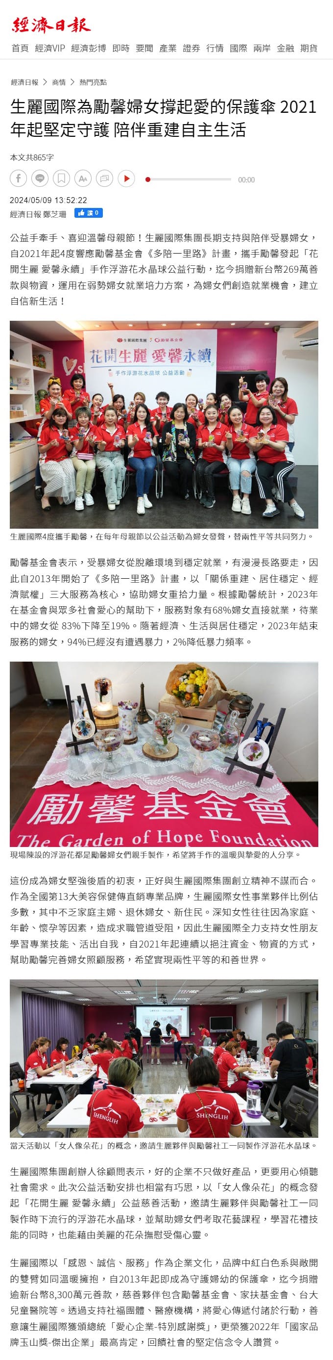 2024-5-9 經濟日報【生麗國際為勵馨婦女撐起愛的保護傘 2021年起堅定守護 陪伴重建自主生活】