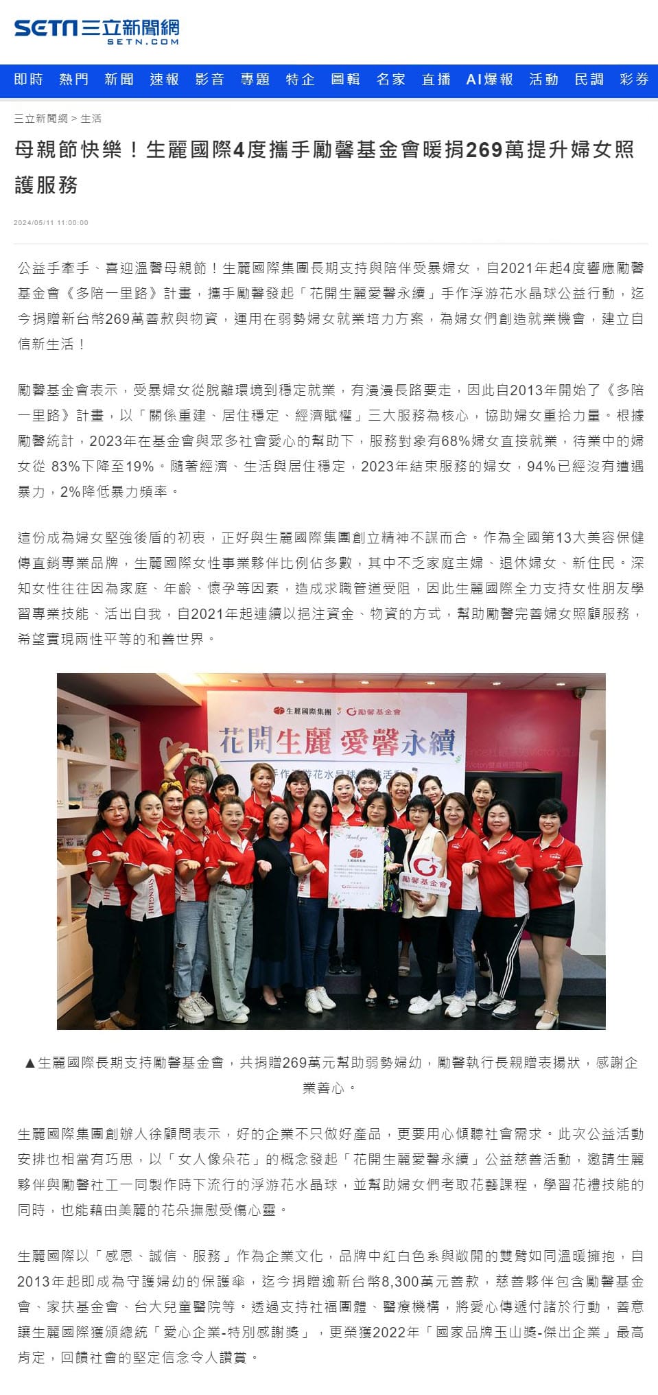 2024-5-11 三立新聞【母親節快樂!生麗國際4度攜手勵馨基金會 暖捐269萬提升婦女照護服務】