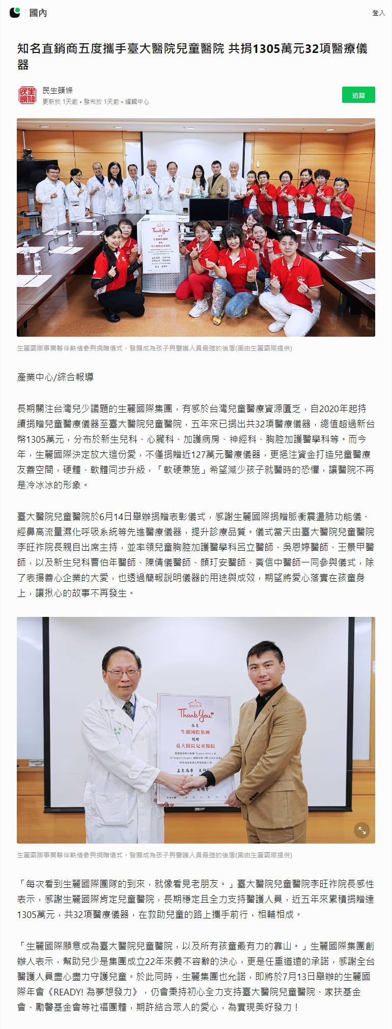 2024-6-17 LINE TODAY【知名直銷商五度攜手臺大醫院兒童醫院 共捐1305萬元32項醫療儀器】