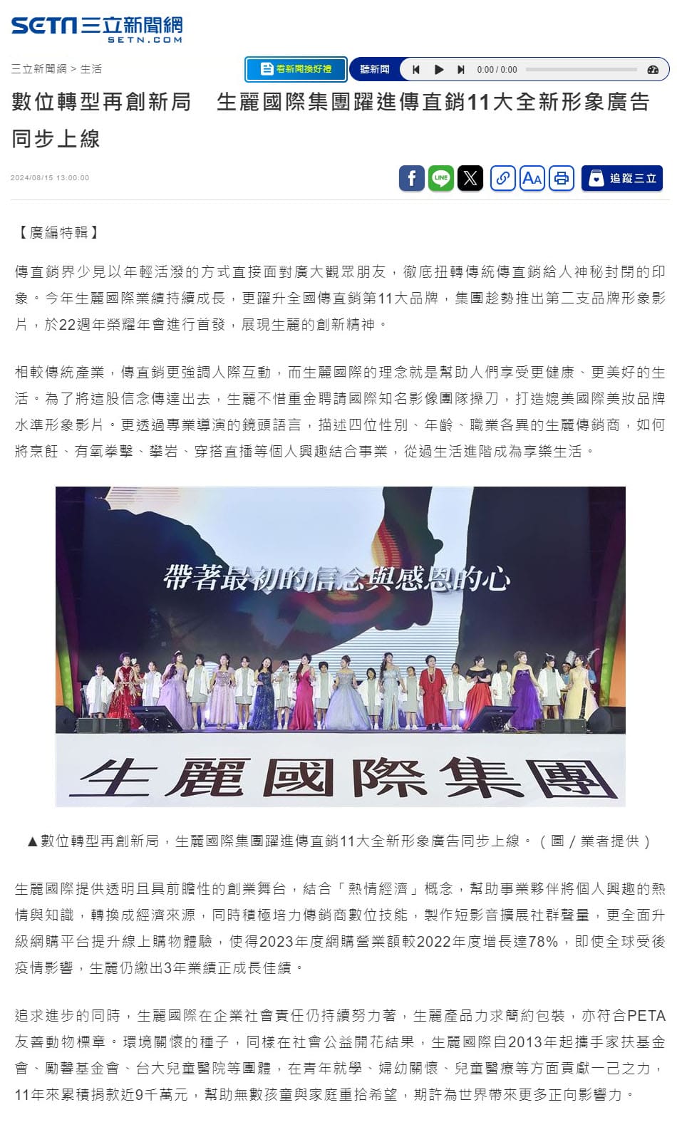 2024-8-15 三立新聞【數位轉型再創新局 生麗國際集團躍進傳直銷11大 全新形象廣告同步上線】