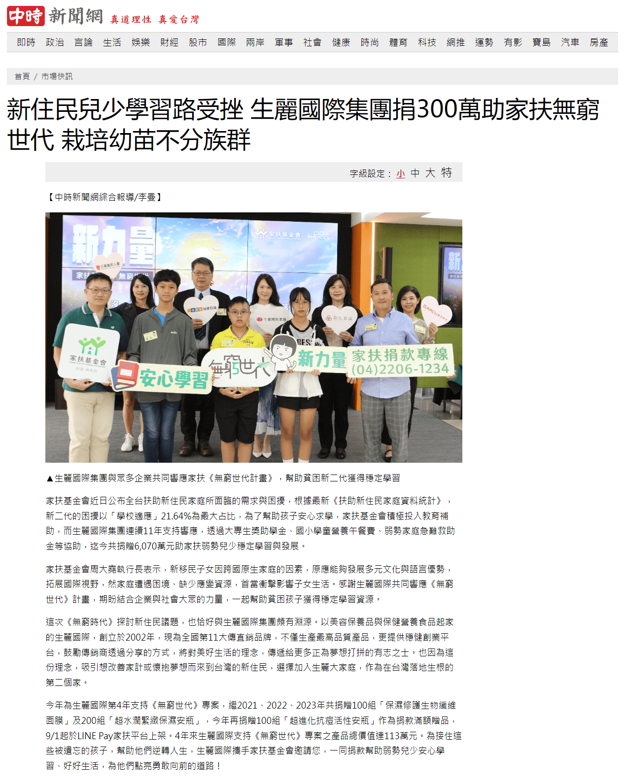 2024-8-27 中時新聞【新住民兒少學習路受挫 生麗國際集團捐300萬助家扶無窮世代 栽培幼苗不分族群】