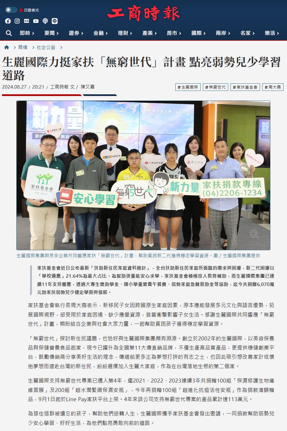 2024-8-27 工商時報【生麗國際力挺家扶「無窮世代」計畫 點亮弱勢兒少學習道路】