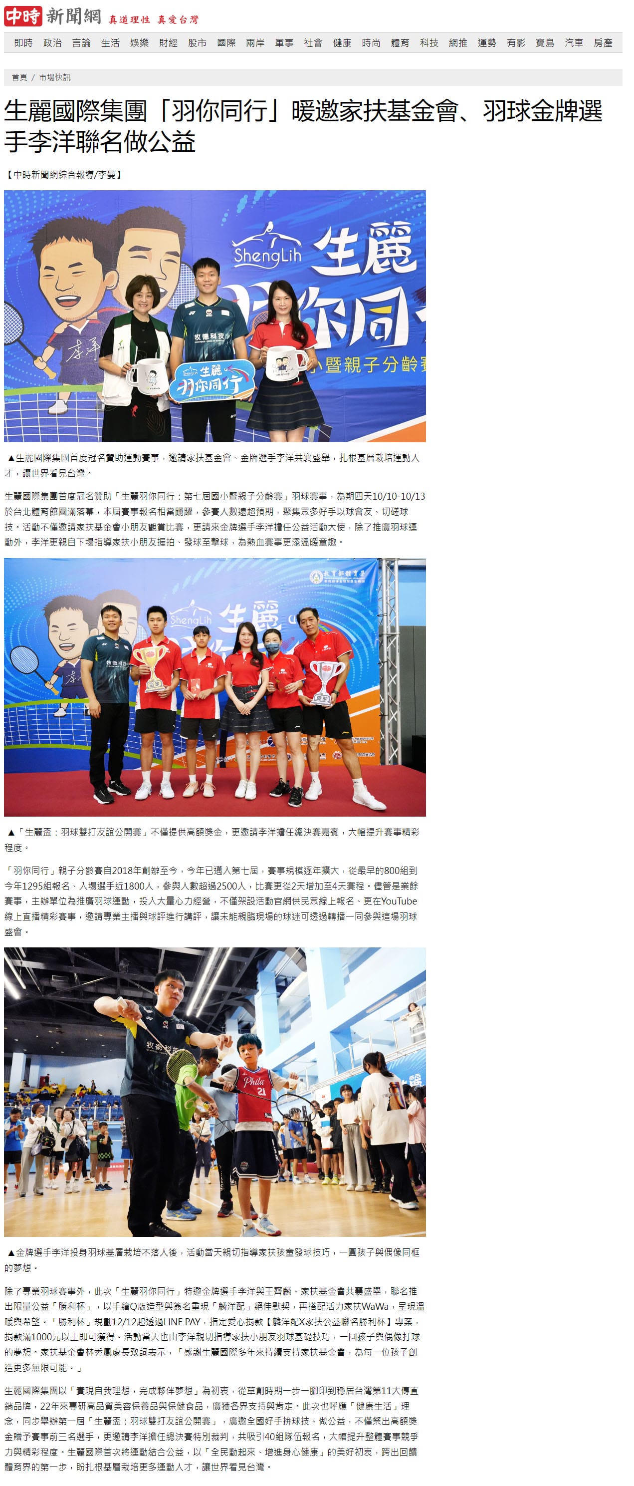 2024-10-14 中時新聞【生麗國際集團「羽你同行」暖邀家扶基金會、羽球金牌選手李洋聯名做公益】
