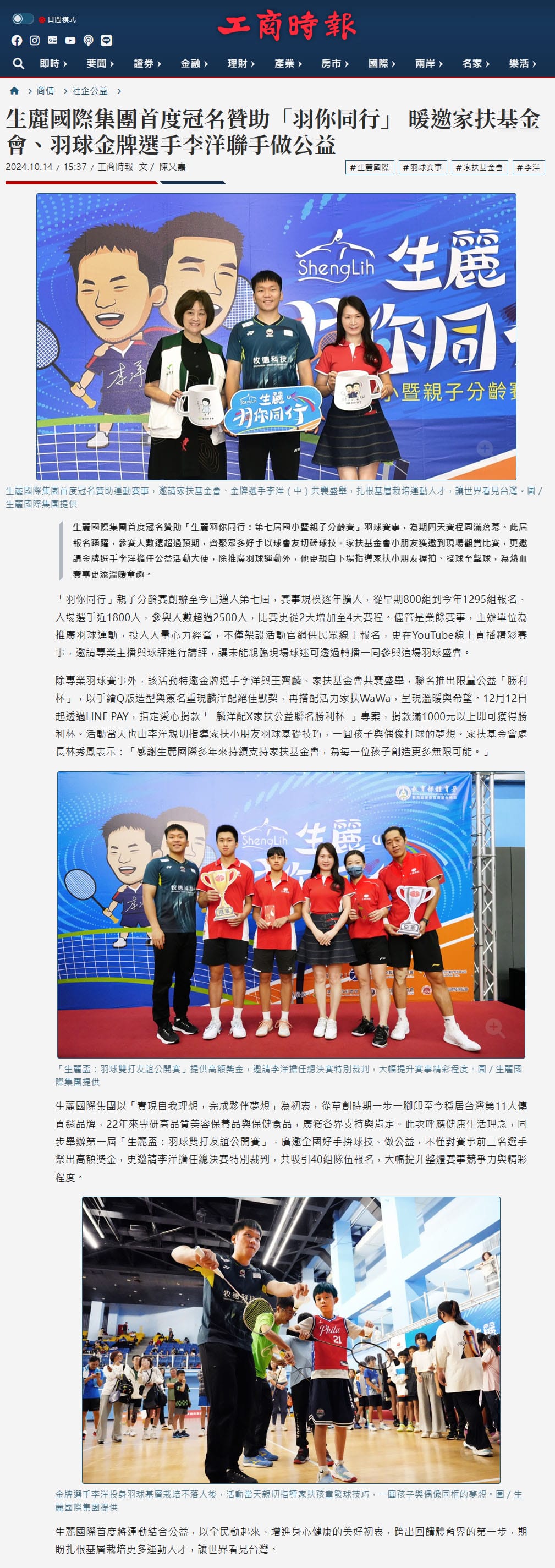 2024-10-14 工商時報【生麗國際集團首度冠名贊助「羽你同行」暖邀家扶基金會、羽球金牌選手李洋聯手做公益】