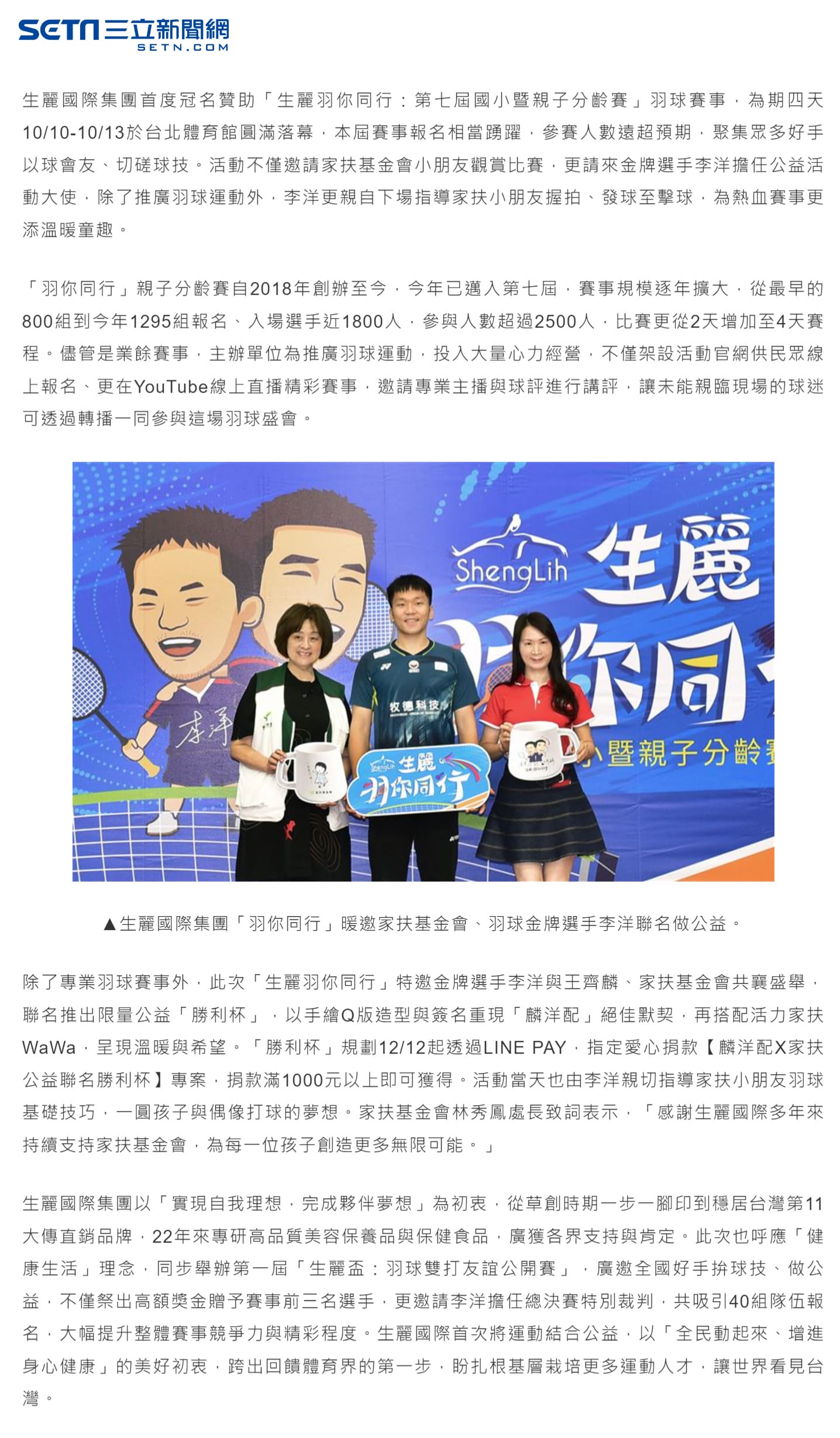 2024-10-16 三立新聞【生麗國際集團「羽你同行」暖邀家扶基金會、羽球金牌選手李洋聯名做公益】
