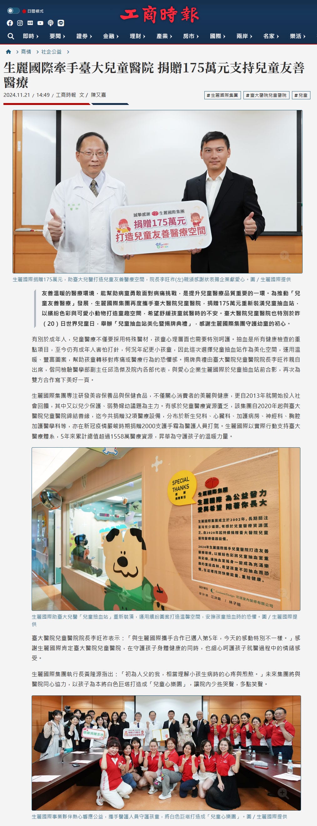 2024-11-21 工商時報【生麗國際牽手臺大兒童醫院 捐贈175萬元支持兒童友善醫療】