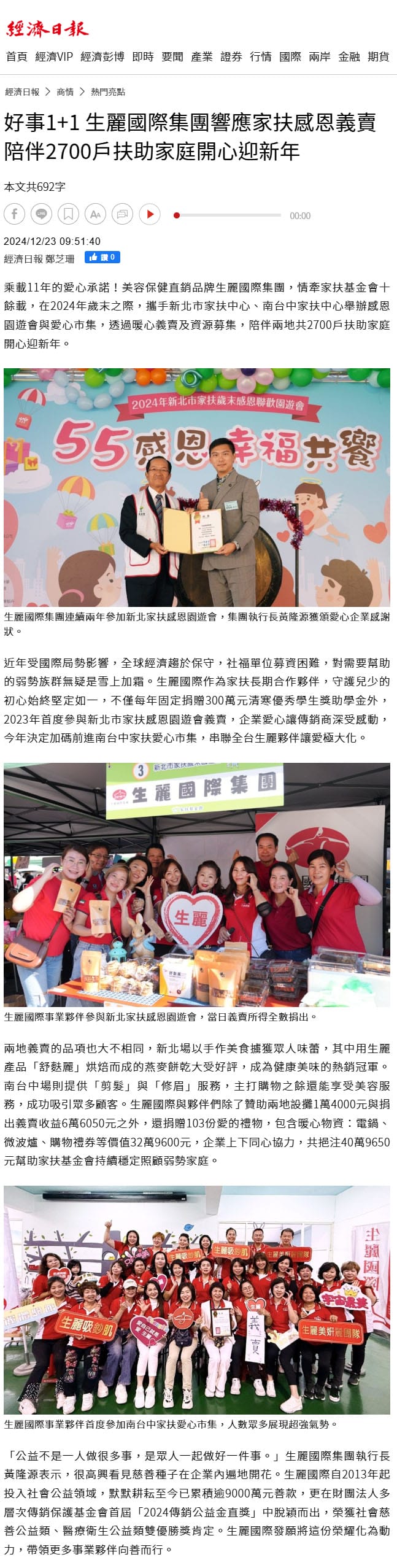 2024-12-23 經濟日報【好事1+1 生麗國際集團響應家扶感恩義賣 陪伴2700戶扶助家庭開心迎新年】