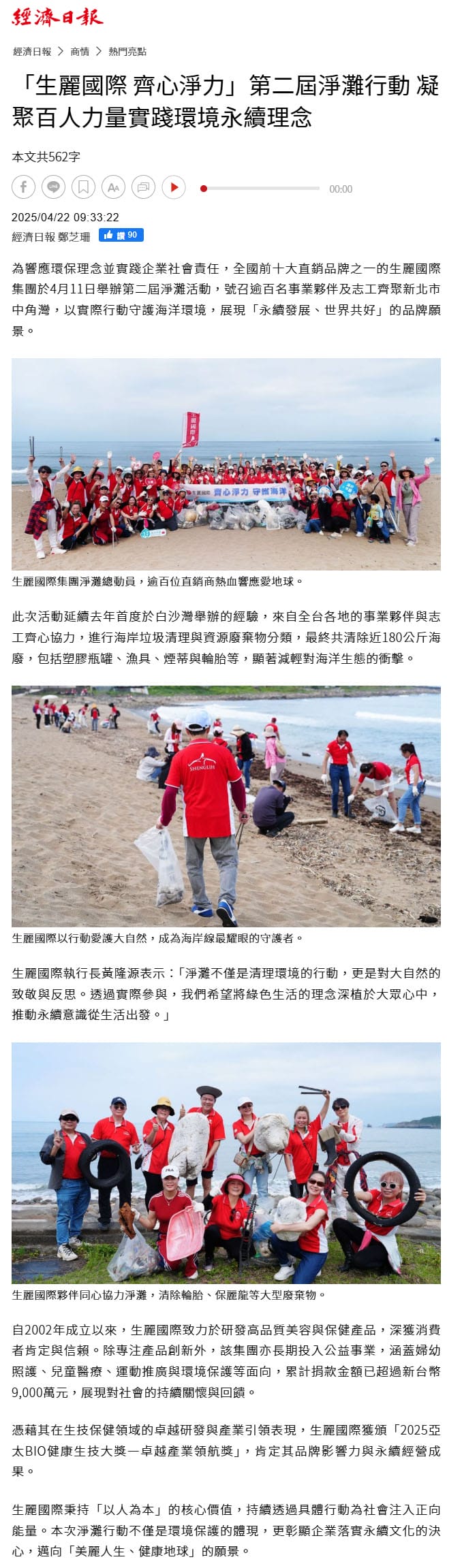 2025-4-22 經濟日報【「生麗國際 齊心淨力」第二屆淨灘行動 凝聚百人力量實踐環境永續理念】