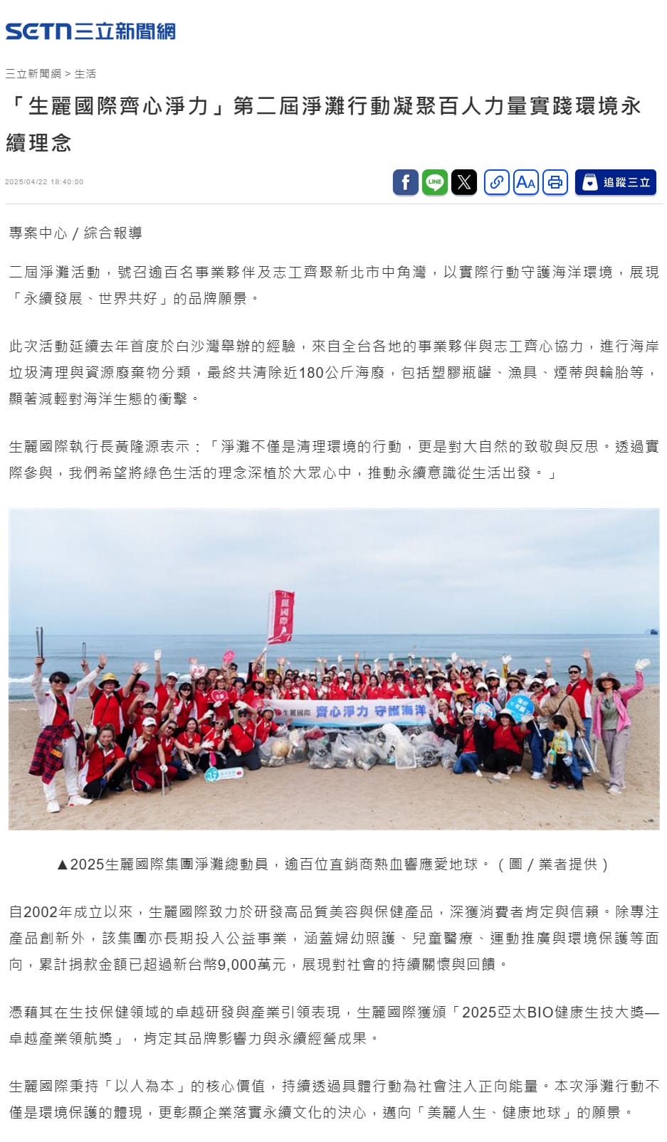 2025-4-22 三立新聞【「生麗國際齊心淨力」第二屆淨灘行動凝聚百人力量實踐環境永續理念】