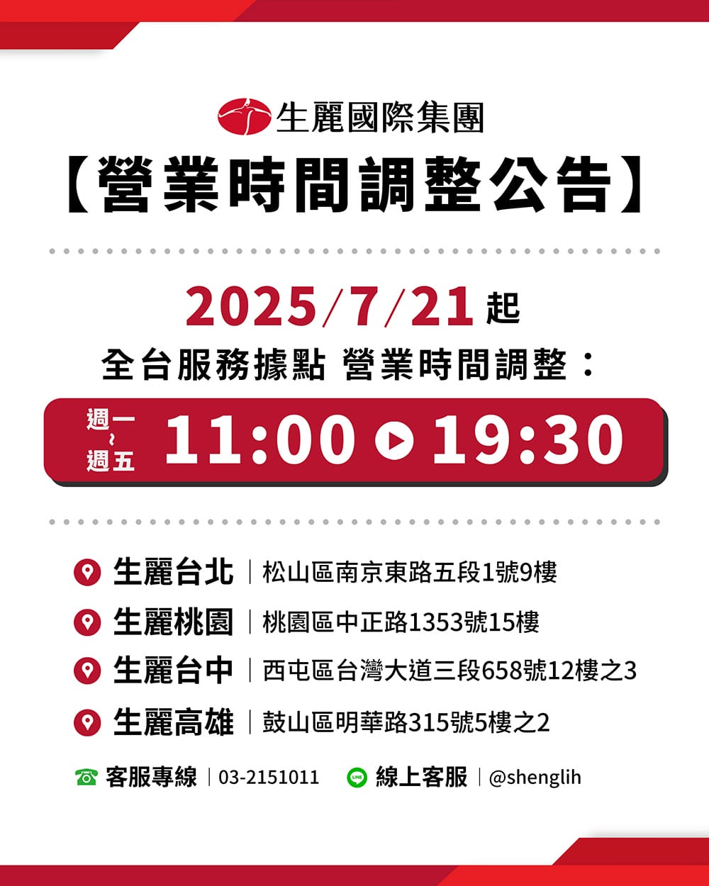 生麗國際集團 營業時間調整公告