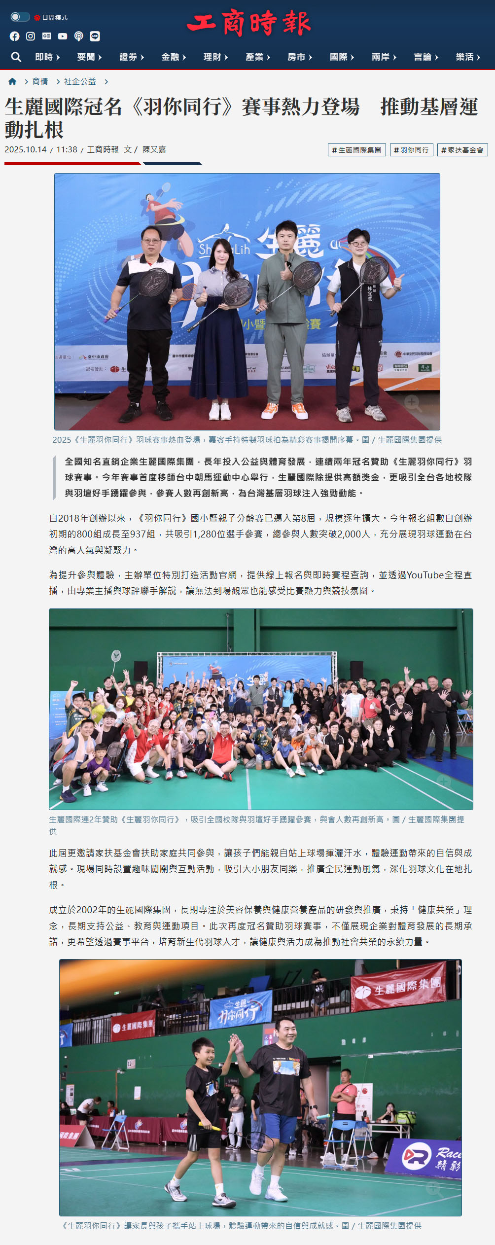 2025-10-14 工商時報【生麗國際冠名《羽你同行》賽事熱力登場 推動基層運動扎根】