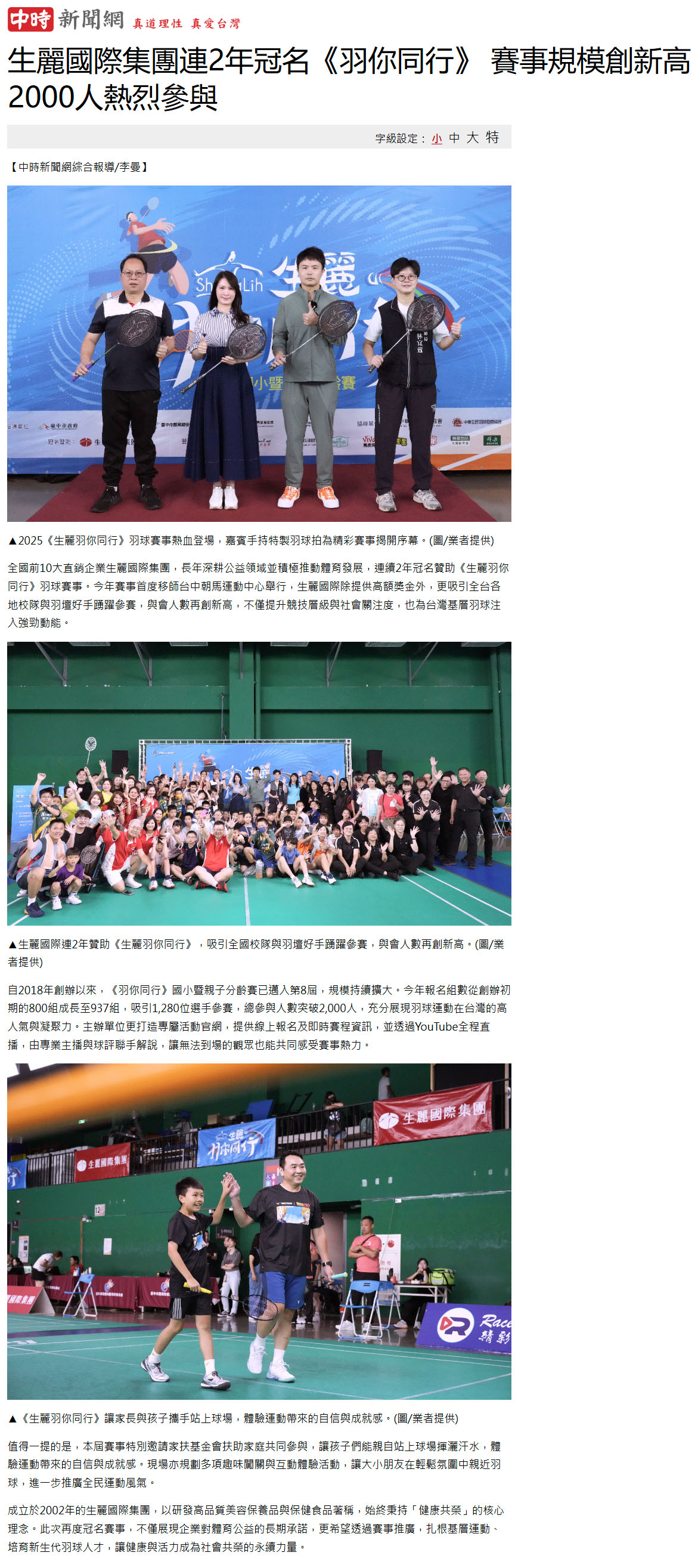 2025-10-14 中時新聞【生麗國際集團連2年冠名《羽你同行》 賽事規模創新高 2000人熱烈參與】
