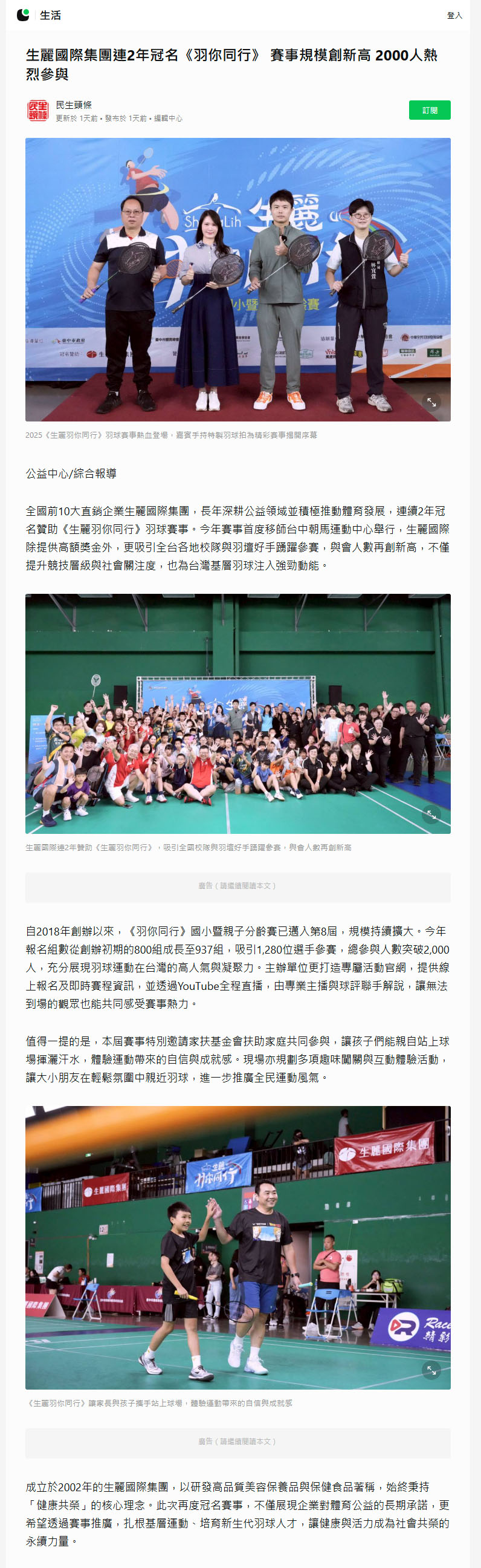2025-10-14 LINE TODAY【生麗國際集團連2年冠名《羽你同行》 賽事規模創新高 2000人熱烈參與】