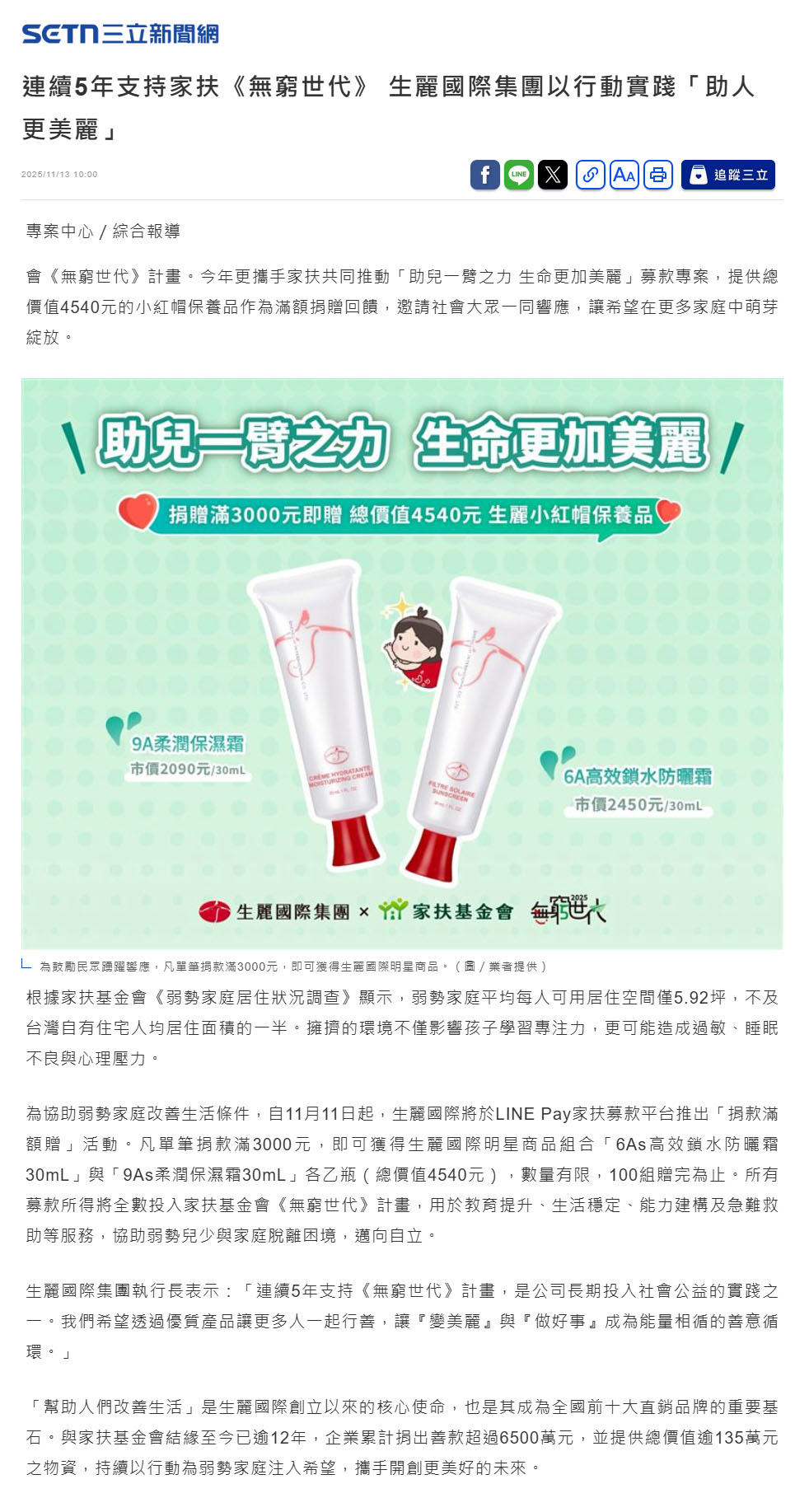 2025-11-13 三立新聞【連續5年支持家扶《無窮世代》 生麗國際集團以行動實踐「助人更美麗」】