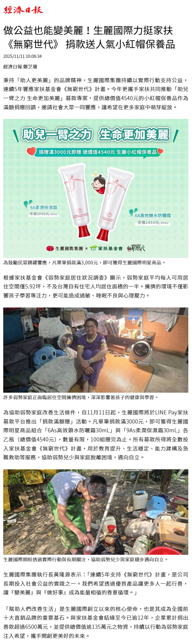 2025-11-11 經濟日報【做公益也能變美麗!生麗國際力挺家扶《無窮世代》 捐款送人氣小紅帽保養品】