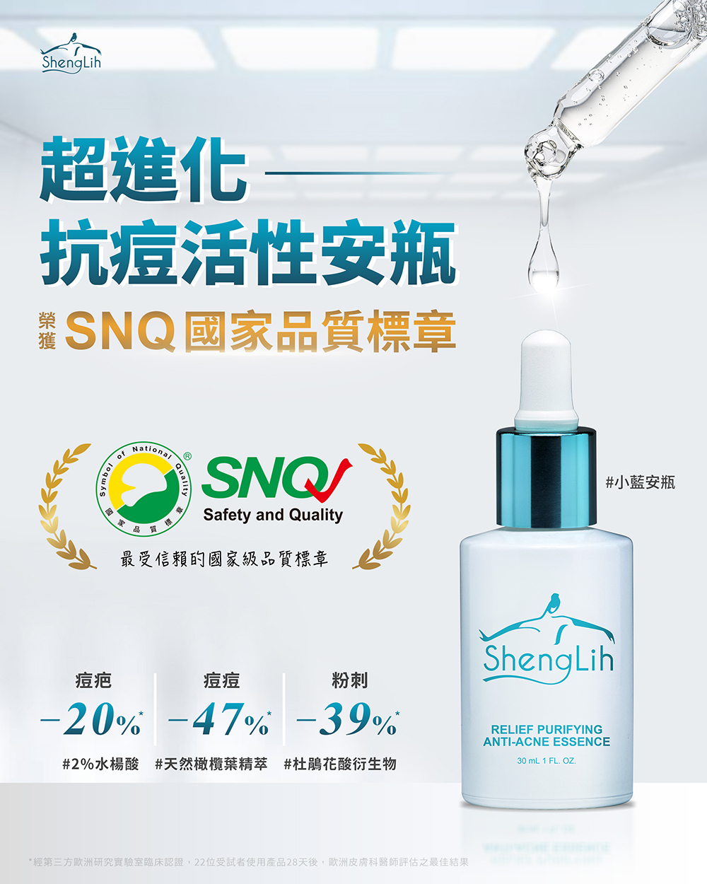 生麗國際 小藍安瓶 榮獲⭐️第28屆 【SNQ國家品質標章】 最受信賴國家級品質標章✨ 專業科學實證為核心 匯聚各界專家評選 三階段審查 一致通過❗ 痘痘 油性肌剋星☀️ 【超進化抗痘活性安瓶】 #水楊酸 #橄欖葉精萃 #杜鵑花酸衍生物 |改善臉部*| ✅ 痘疤 -20% ✅ 痘痘 -47% ✅ 粉刺 -39% 國家級榮譽肯定 淨痘新時代來臨 打造柔順平滑肌✨ *22名女性使用產品28天之最佳結果 分享到