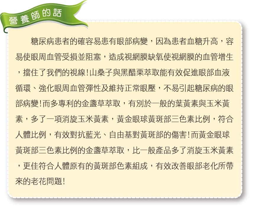 新北市 郭小姐 我今年六十歲,患糖尿病已十年了,眾所周知,糖尿病如果血糖控制不好,會引發諸多併發症,其中最重要的就是眼底病變!我母親就是因為沒控制好血糖,導致眼底血管瘤,經過激光、甚至手術無法改善最後導致雙目失明!我照顧她多年深知其痛苦,所以當我發現自己也患有糖尿病以後,一方面嚴格控制血糖,另外格外注重眼部保護,當我得知有保健食品可以為我們眼睛補充優質葉黃素,來保護我們眼睛的黄斑部,我非常開心!因為經常陪母親就醫,已知道她就是因為眼睛黃斑部病變才導致失明,於是在發現這款保健食品就開始吃,至今已五年多,從未間斷。正常來說糖尿病人每年都應該定期檢查眼底,如果一旦有血管瘤,可盡早激光打掉,避免出血。可因為忙碌,儘管家門口就有眼科,十年我從未檢測眼底,前幾天突然想去檢測,結果醫生告訴我一切正常!我還問醫生沒有白內障嗎?醫生說也沒有!哇,我當時非常高興!我小學三年就近視,50歲又患糖尿病,至今已十年了,平常又與手機為伴,正常人因為年老視衰也會造成飛蚊症、白內障等眼疾,可我卻安然無恙!真的由衷地感謝有這麼好的產品!讓我60歲依然擁有健康的明目,實在太開心了!而且之前有測血糖,因為勞碌三餐不正常,血糖控制並不好,即便在這種情況下,眼底卻完好無損,由衷感謝公司有這麼好的產品!可以為我們視力保駕護航,讓我們不會擔心因年老、疾病導致視力衰退! 分享到
