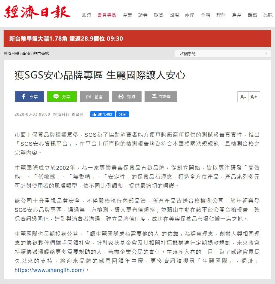 經濟日報「獲SGS安心品牌專區 生麗國際讓人安心」