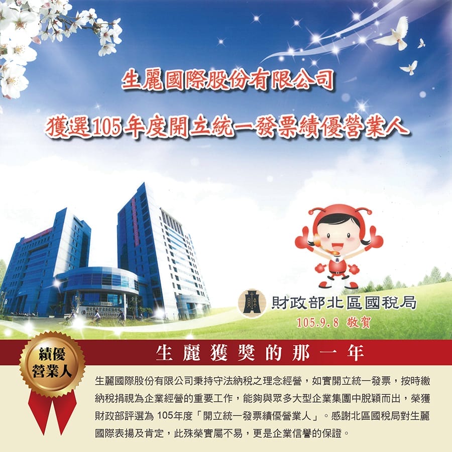 生麗國際股份有限公司秉持守法納稅之理念經營,如實開立統一發票,按時繳納稅捐視為企業經營的重要工作,能夠與眾多大型企業集團中脫穎而出,榮獲財政部評選為 105年度「開立統一發票績優營業人」。感謝北區國稅局對生麗國際表揚及肯定,此殊榮實屬不易,更是企業信譽的保證。 分享到