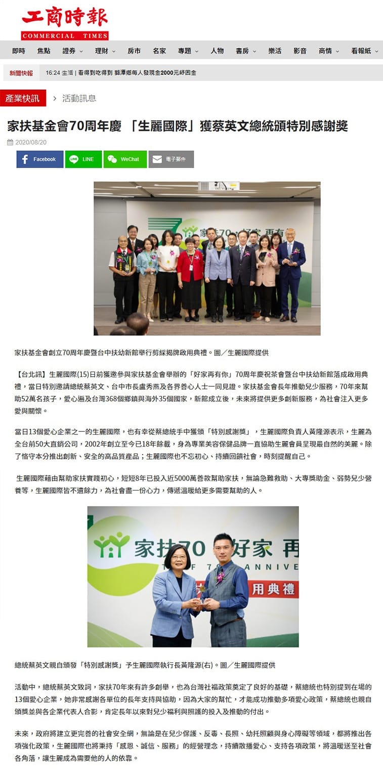 2020-8-20 工商時報【家扶基金會70周年慶 「生麗國際」獲蔡英文總統頒特別感謝獎】