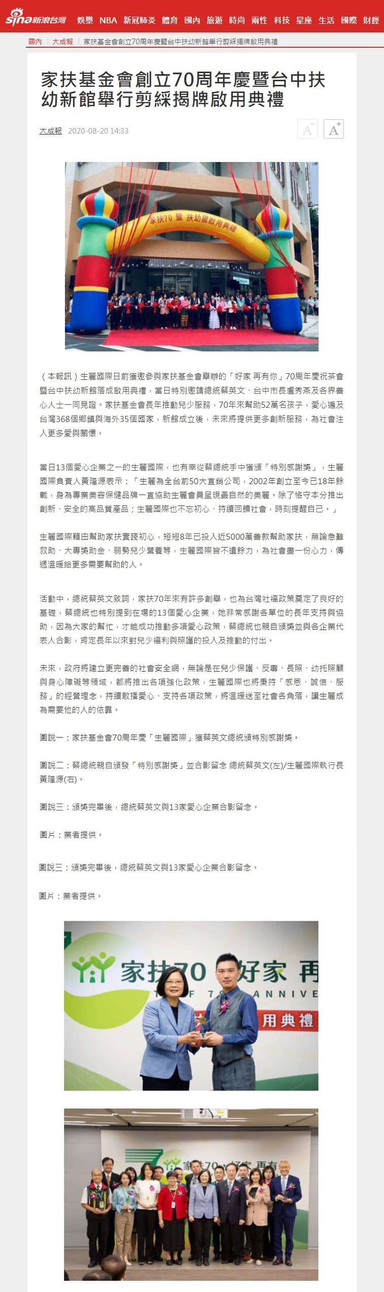 2020-8-20 新浪台灣【家扶基金會創立70周年慶暨台中扶幼新館舉行剪綵揭牌啟用典禮】