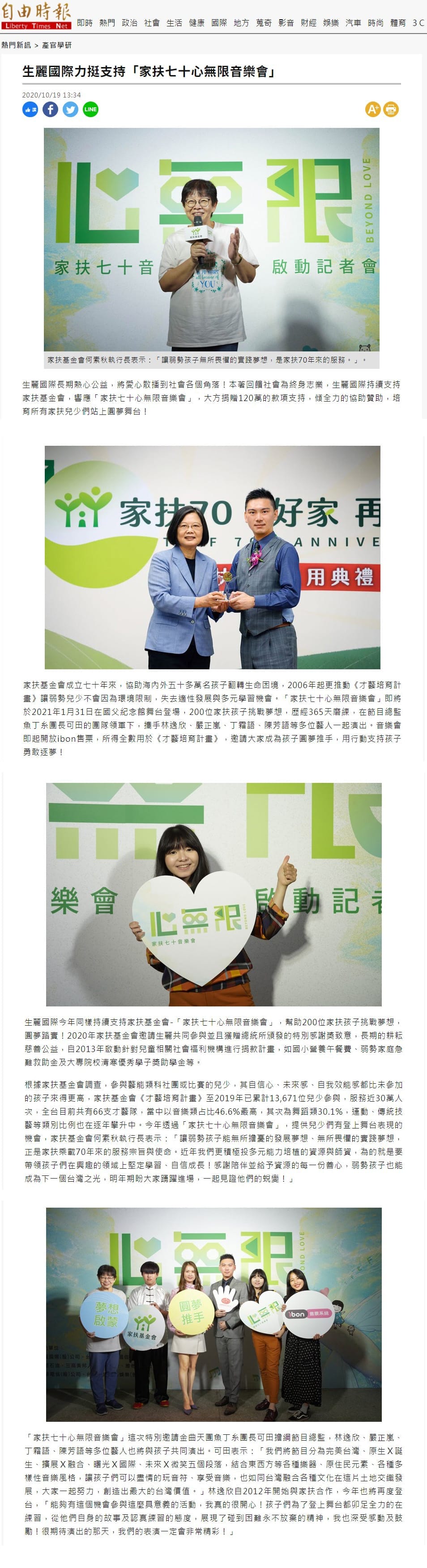 2020-10-19 自由時報【生麗國際力挺支持「家扶七十心無限音樂會」】